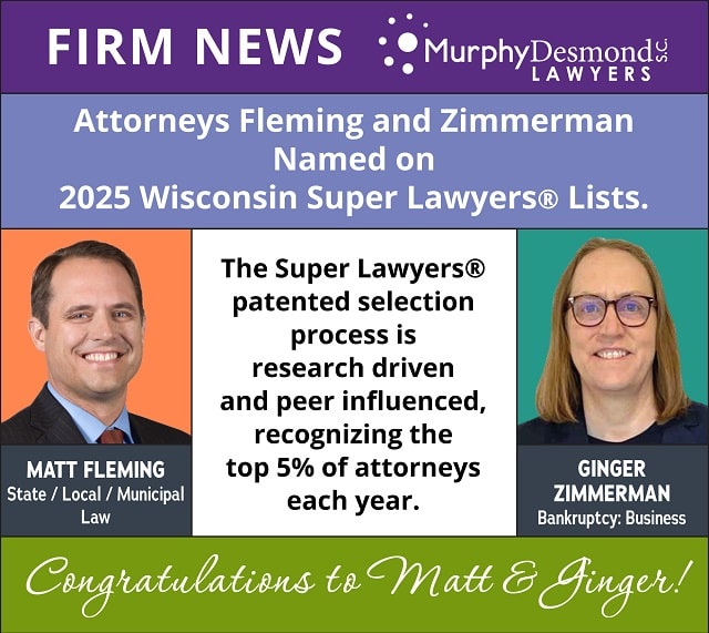 The firm is pleased to announce that Matt Fleming and Ginger Zimmerman are included on lists for 2025 Wisconsin Super Lawyers®, and Ginger is named on additional “Top” lists.